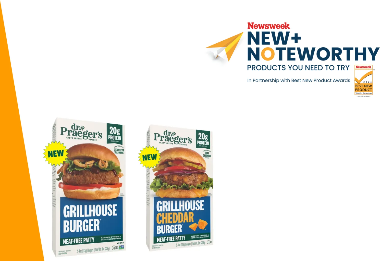 ...Dr. Praeger's Grillhouse Burgers are a new line of plant-based burgers that offer a bold, steakhouse-style flavor and 20 grams of protein per patty. The burgers are made with a blend of real vegetables like sweet potato, butternut squash, carrots, and onions, and come in both a vegan original and a Cheddar Burger version with real cheese.