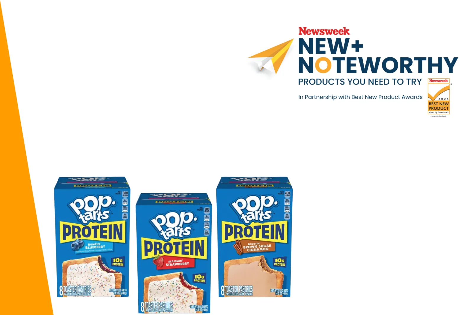 ...Meet Pop-Tarts Protein, the latest innovation for protein-minded snackers. These new toaster pastries deliver 10 grams of protein per serving while staying true to the classic Pop-Tarts flavors fans love. Available in three varieties: Slammin' Strawberry, Bumpin' Blueberry and Boostin' Brown Sugar Cinnamon.